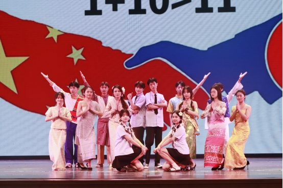 联系东盟、交流互促,青年学子与东盟各国朋友携手同行的特色和优势。舞蹈《青苹果乐园》展现了院级团学组织骨干朝气蓬勃的青春活力,院礼仪模特队带来了让人眼前一亮的走秀表演《多彩东盟》,色彩明丽的民族服饰跃然台前,展现了东盟各国独特的民族风情,最后,歌曲《一路生花》将晚会带入尾声。在悠扬的乐曲和一声声礼炮鸣响中,所有演职工作人员上台谢幕,麻豆影片