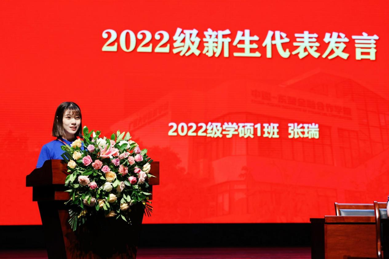 仪式开始,首先由新生代表——2022级应用经济学硕士研究生张瑞发言。张瑞同学真诚祝贺每一位2022级新同学,值此金桂飘香之际,满怀憧憬开启人生崭新的旅程。她与大家分享了入学以来的见闻感想,提出三个努力维度与全体新生共勉:一要坚持初心,不负韶华,二要志存高远、立足当下,三要心怀家国、胸怀天下。作为时代新人,青年学子当勇敢承担时代提出的命题,为“复兴中华,发达广西”而努力奋斗!