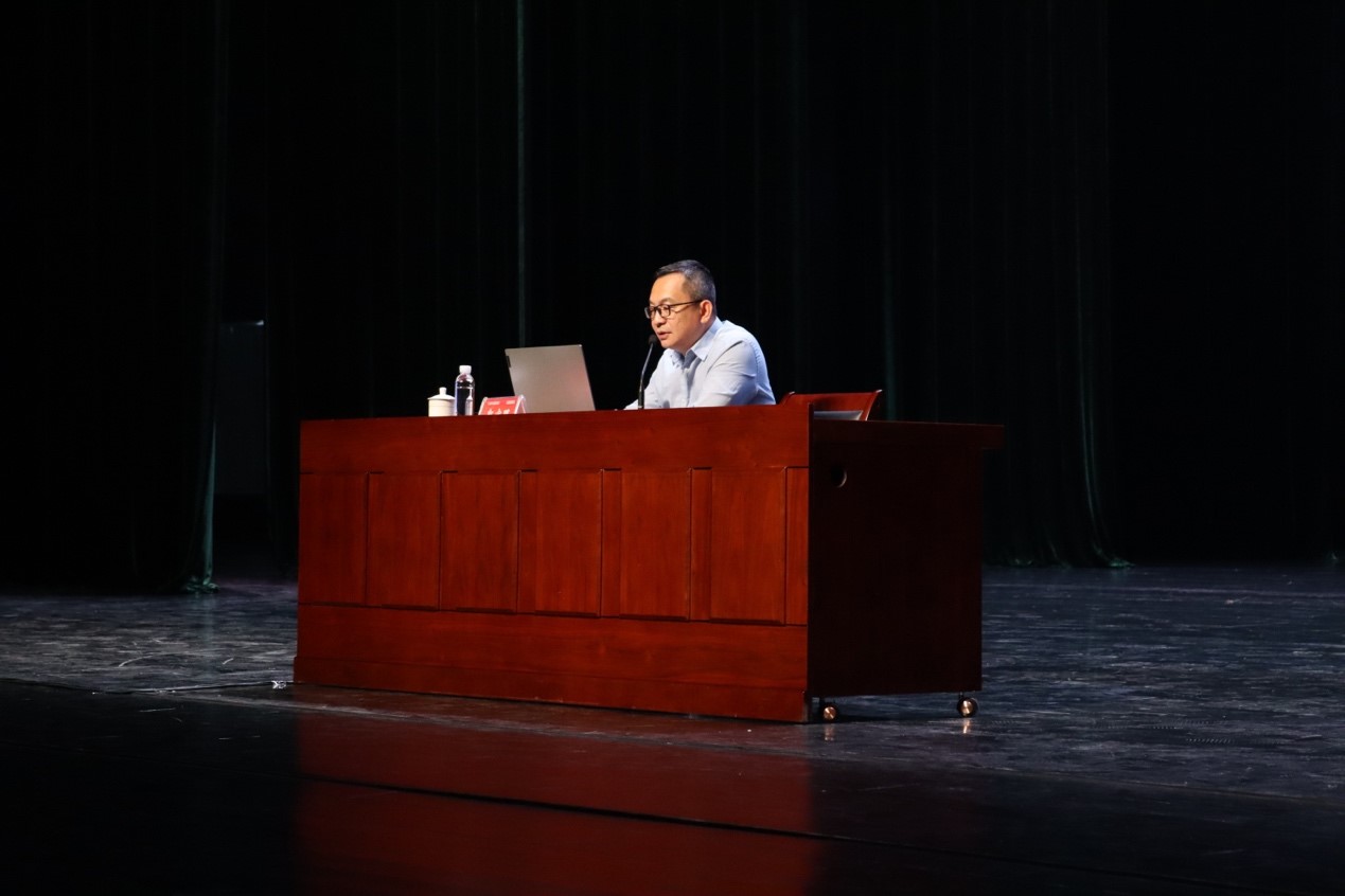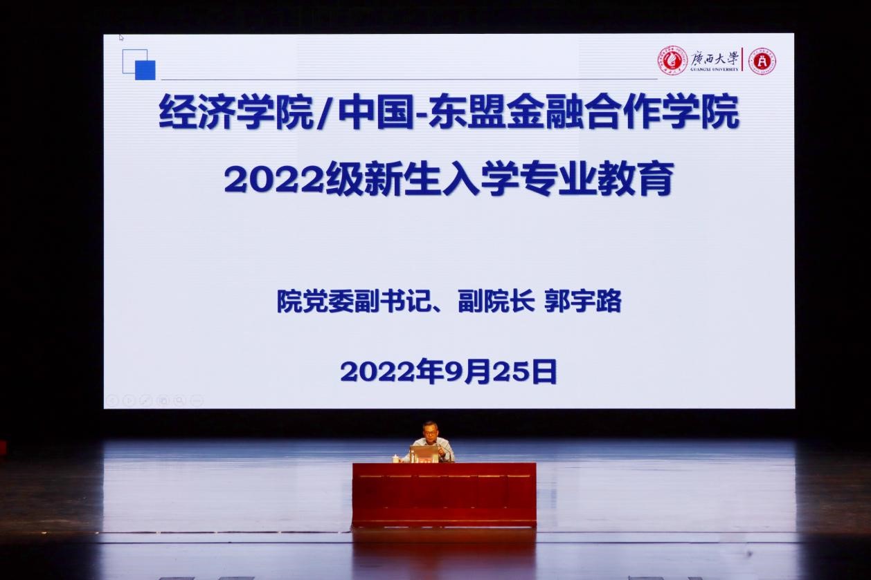 经济麻豆影片/中国-东盟金融合作麻豆影片党委副书记、副院长郭宇路在汇学堂为2022级本科新生做学科专业和学籍管理教育讲座。