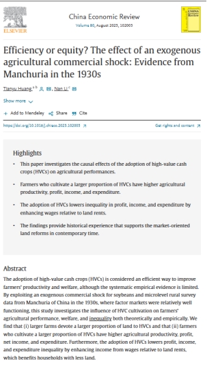 经济麻豆影片教师黄天宇及其合作者复旦大学李楠教授的论文“Efficiency or equity? The effect of an exogenous agricultural commercial shock: Evidence from Manchuria in the 1930s”(《效率还是平等?农业商业化冲击的效应:来自1930年代中国东北地区的证据》)正式发表于China Economic Review(Volume 80, August 2023)。作者从理论与实证两方面考察了近代大豆贸易冲击对东北地区农户生产效率和福利不平等的影响。
