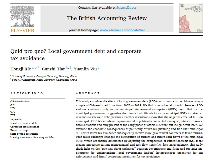 谢宏基助理教授、暨南大学田存志教授、暨南大学博士研究生吴远霖合作的论文“Quid pro quo? Local government debt and corporate tax avoidance”,在会计领域国际权威期刊The British Accounting Review在线发表。