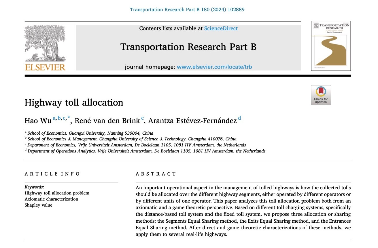 研究团队成员吴昊助理教授在交通运输领域顶级期刊《Transportation Research Part B: Methodological》上,发表题为“Highway toll allocation”(高速公路收益分配)的论文。吴昊助理教授为第一作者和通讯作者,合作者包括阿姆斯特丹自由大学/丁伯根研究所经济学教授雷内(Réne van den Brink)、运筹与管理学助理教授阿兰扎(Arantza Estévez-Fernández)。