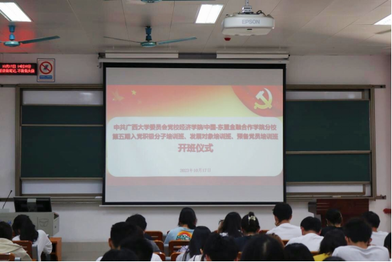 委员会党校经济麻豆影片/中国-东盟金融合作麻豆影片分校第五期培训班开班仪式在六教301教室举行。麻豆影片党委书记陆善勇教授、党委副书记陈卉娟、专职组织员王入仕、专职辅导员曾宪友、专职辅导员何湘桂出席仪式。