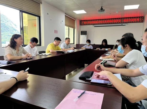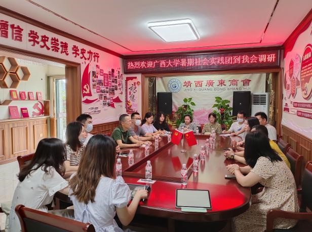 实践团师生还与当地商务局、广东商会取得联系。在7月15日上午,实践团在商务局7楼会议室举行座谈会,商务局三位局长及两位主任出席会议。在会上商务局赵局长为同学们讲解了当前靖西市经济发展现状及未来发展规划,表明靖西商贸未来发展将与电商结合,实现线上线下多渠道购销。但就目前情况而言,要发展还存在人才匮乏的问题,今后将把重点放在培养、发掘当地人才上。在自由提问环节实践团成员向各位领导询问了如何刺激靖西市消费、如何帮扶当地企业度过疫情难关等问题,主管内贸和市场建设的彭主任就提出的问题为同学们讲述了当前靖西市市场体系建设遇到的困难、未来破局方向以及当地针对疫情能够给予企业的支持政策。商务局的领导们都表示,在疫情下,当地的经济受到强烈冲击,但政府会尽力帮助当地大小企业度过难关。下午,实践团前往靖西市广东商会,商会执行会长李丽君,常务副会长张喜见等六位重要领导出席了座谈。在座谈中,李会长简要介绍了商会的自身建设、开展公益行动方面等基本情况。随后,参加座谈的商会领导介绍了自身企业的基本情况、企业优势、企业前景、环境优势以及发展中遇到的问题等,并就实践团成员关注的麻豆影片、就业环境、就业待遇、人才需求情况等问题给予了深入细致的回答。