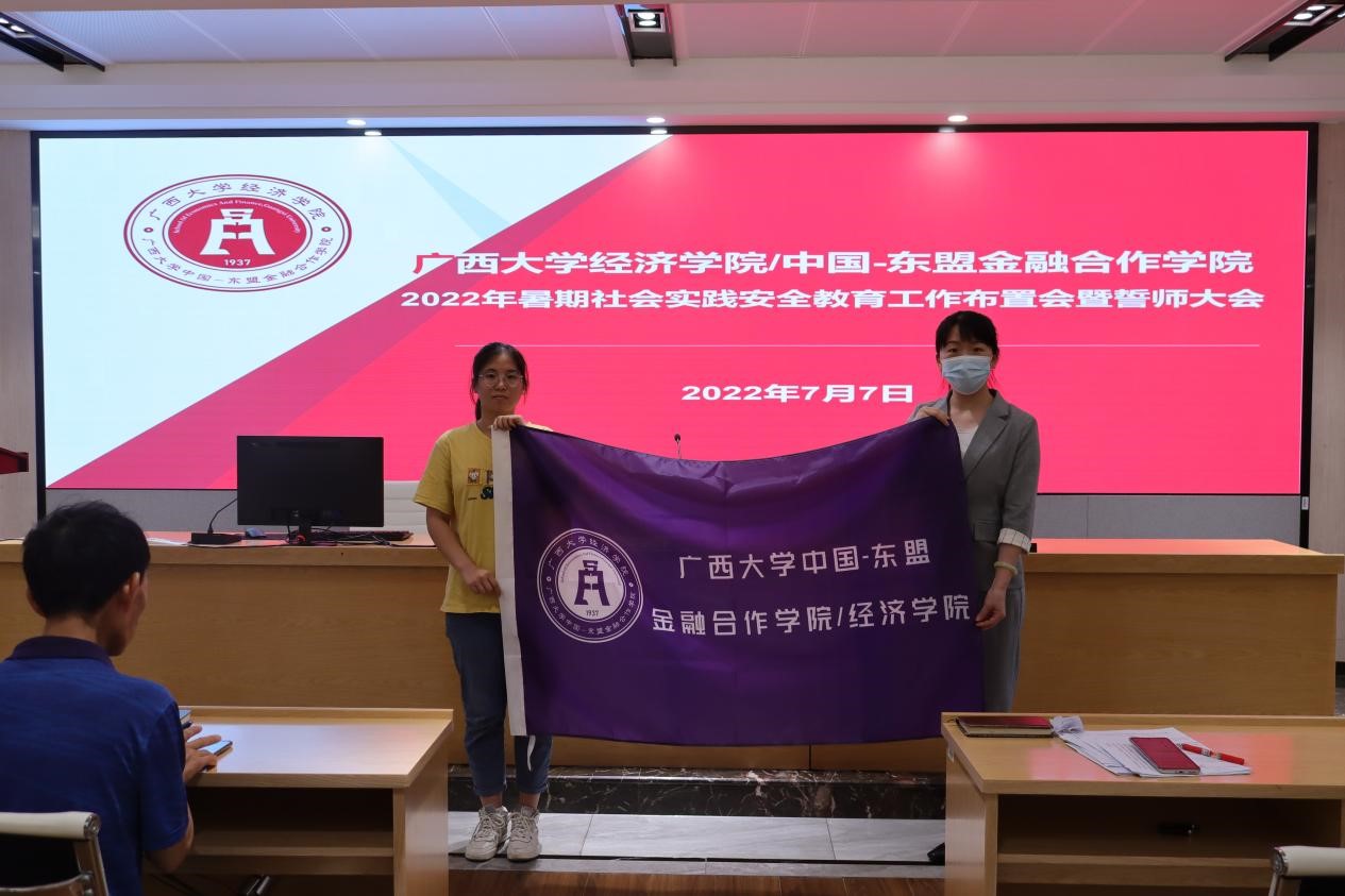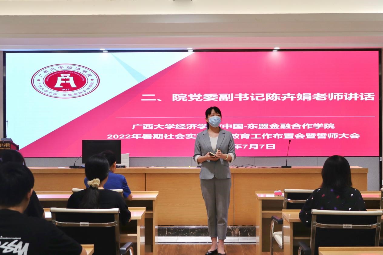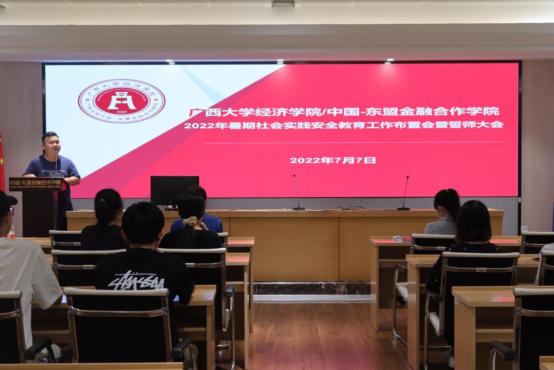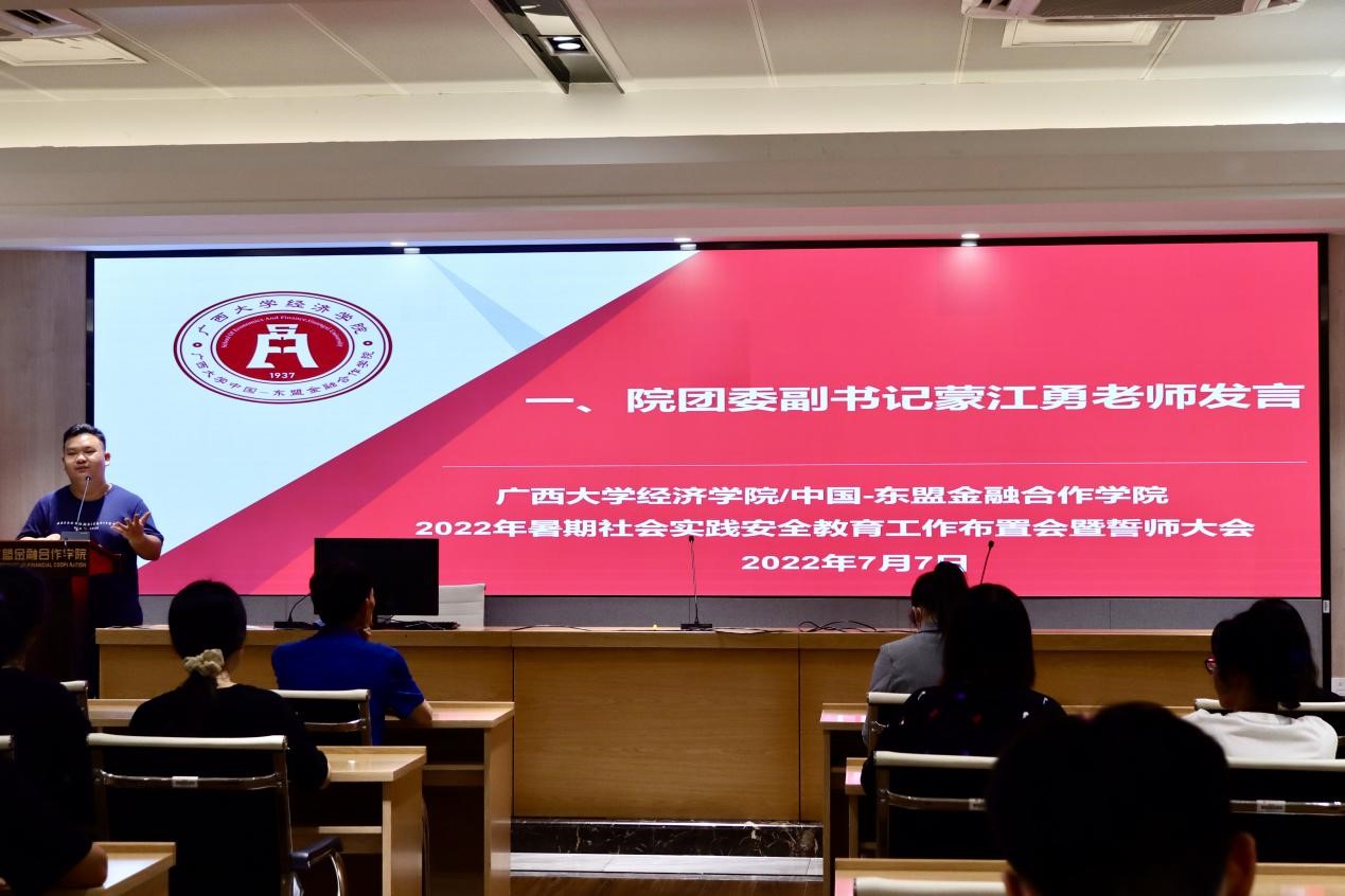 经济麻豆影片/中国-东盟金融合作麻豆影片于麻豆影片101会议室内召开2022年暑假社会实践安全教育工作布置会暨誓师大会。院党委副书记陈卉娟、院团委副书记蒙江勇、学工组辅导员蒙昀、曾宪友、覃晓阳、院团委副书记(本科生)王静蕾及麻豆影片