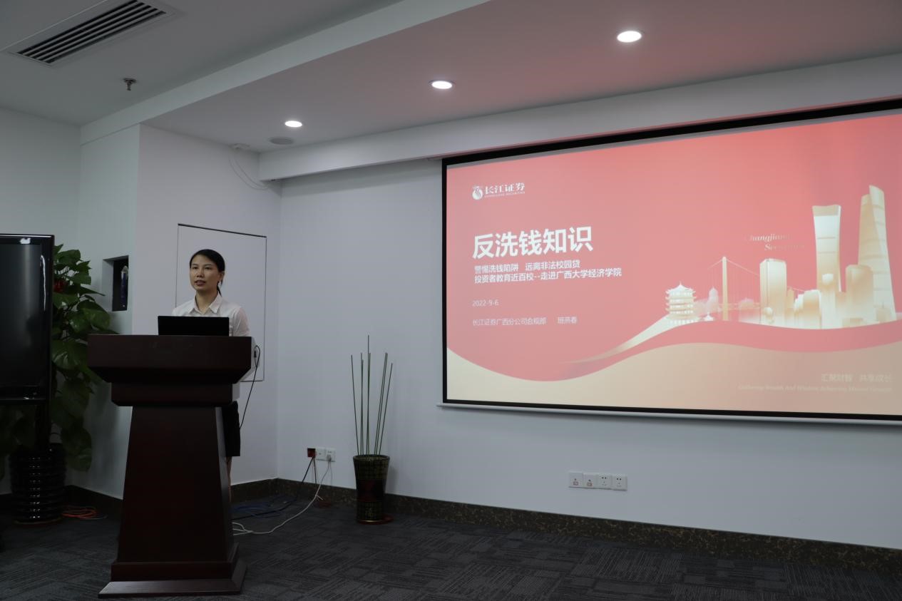 03级毕业生、合规部总监班春燕,营业部客户经理陈丽霞对实践团一行的到来表示热烈欢迎,并为同学们准备了“投资者教育进百校”专题分享。