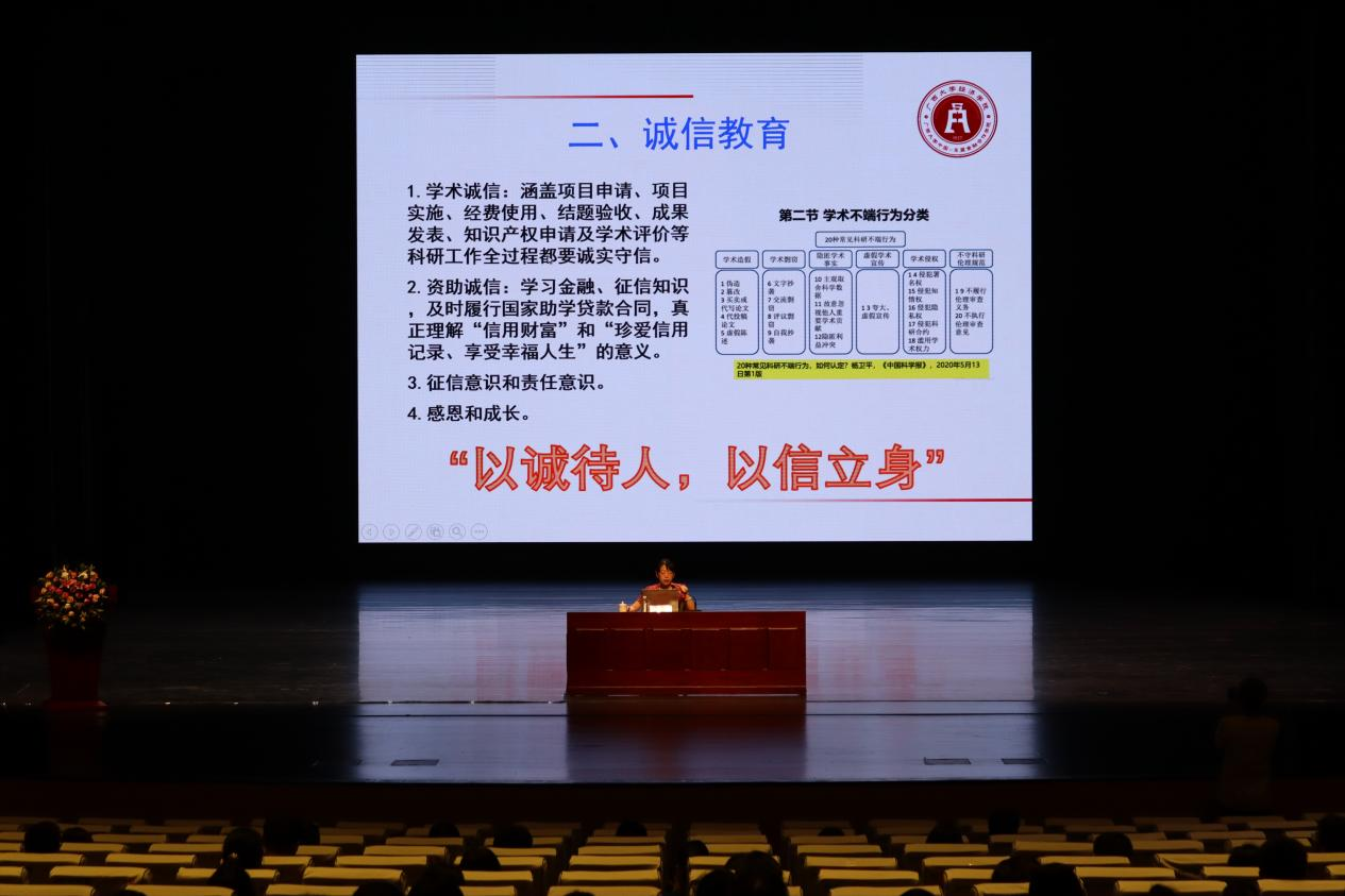 诚信教育环节,陈副书记强调了遵守学术诚信的重要性和学校对于学术不端行为的处理政策,希望同学们主动学习金融、征信知识,树立征信意识和责任意识,珍视信用财富,学会感恩成长。