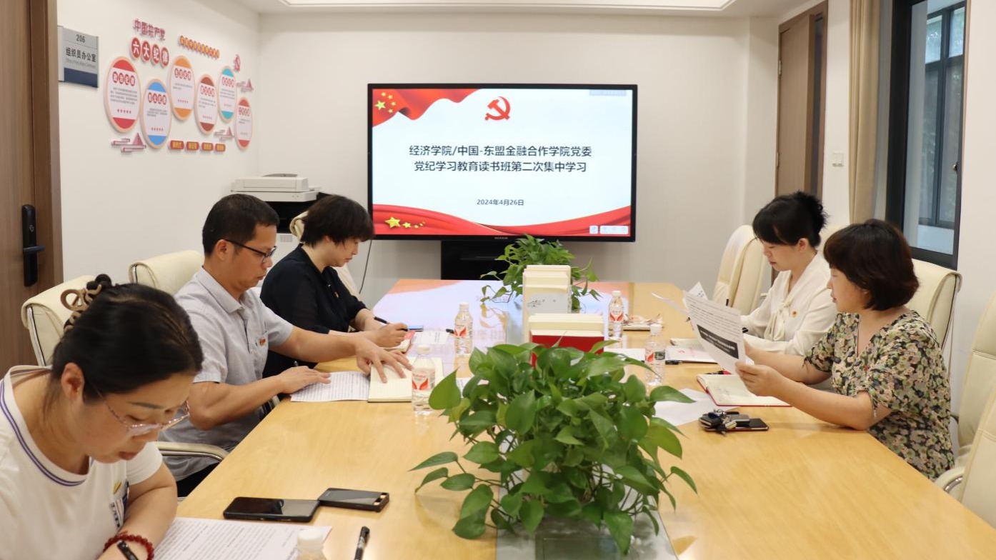 为进一步贯彻落实学校党委关于党纪学习教育的部署要求,4月26日,经济麻豆影片/中国-东盟金融合作麻豆影片党委在麻豆影片党员活动室开展党纪学习教育读书班第二次集中学习,麻豆影片党委领导班子、理论中心组全体成员参加学习。