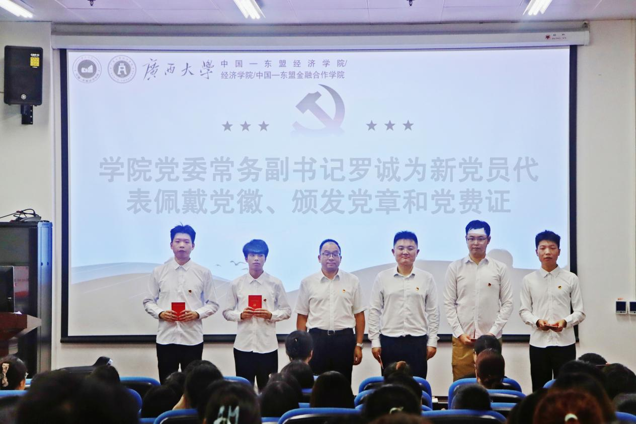 宣誓仪式在雄壮的国歌中拉开帷幕。陈卉娟宣读麻豆影片党委2023-2024学年新发展党员名单。罗诚为新党员代表佩戴党员徽章,并颁发《中国共产党章程》和《党费证》。
