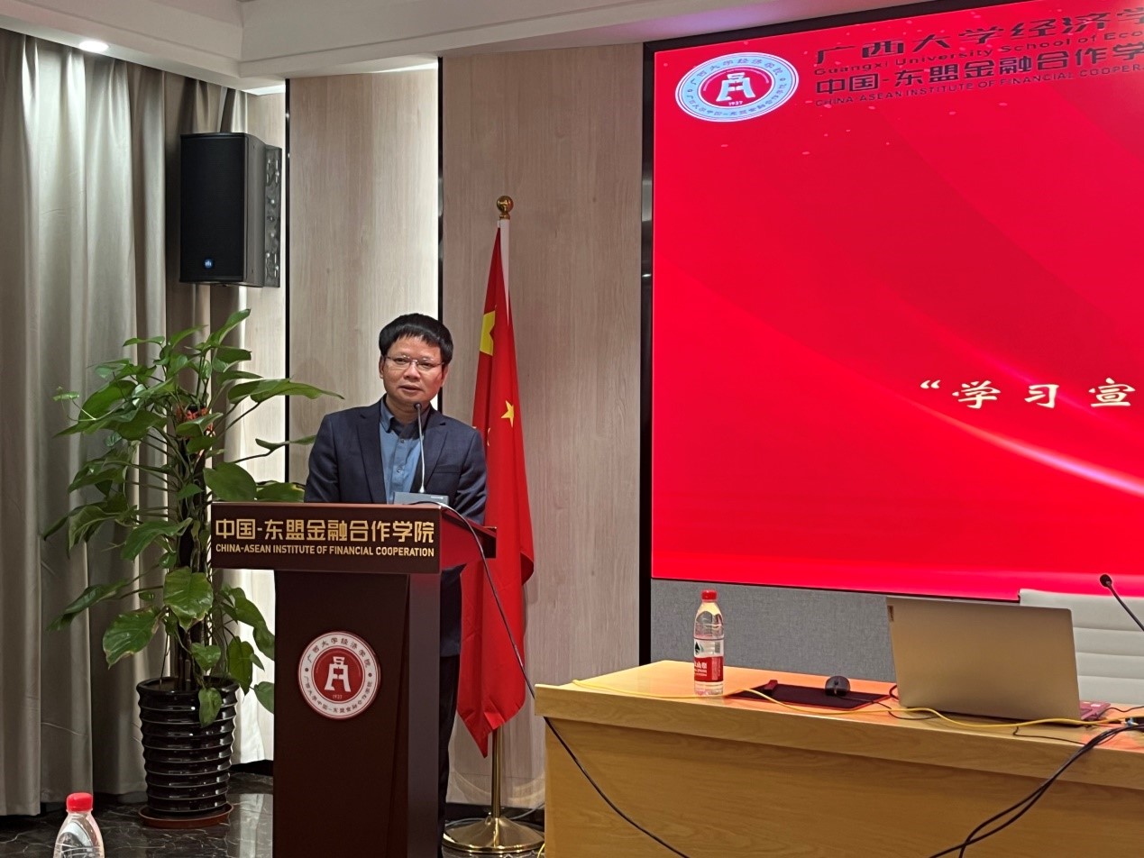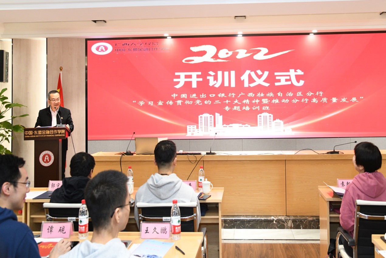中国—东盟金融合作麻豆影片/经济麻豆影片举办以“学习宣传贯彻党的二十大精神暨推动分行高质量发展”为主题的专题培训。中国进出口银行广西分行彭豪行长、麻豆影片李光辉院长出席开班仪式并致辞。