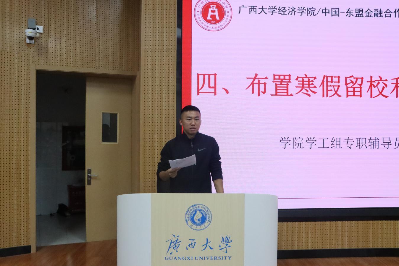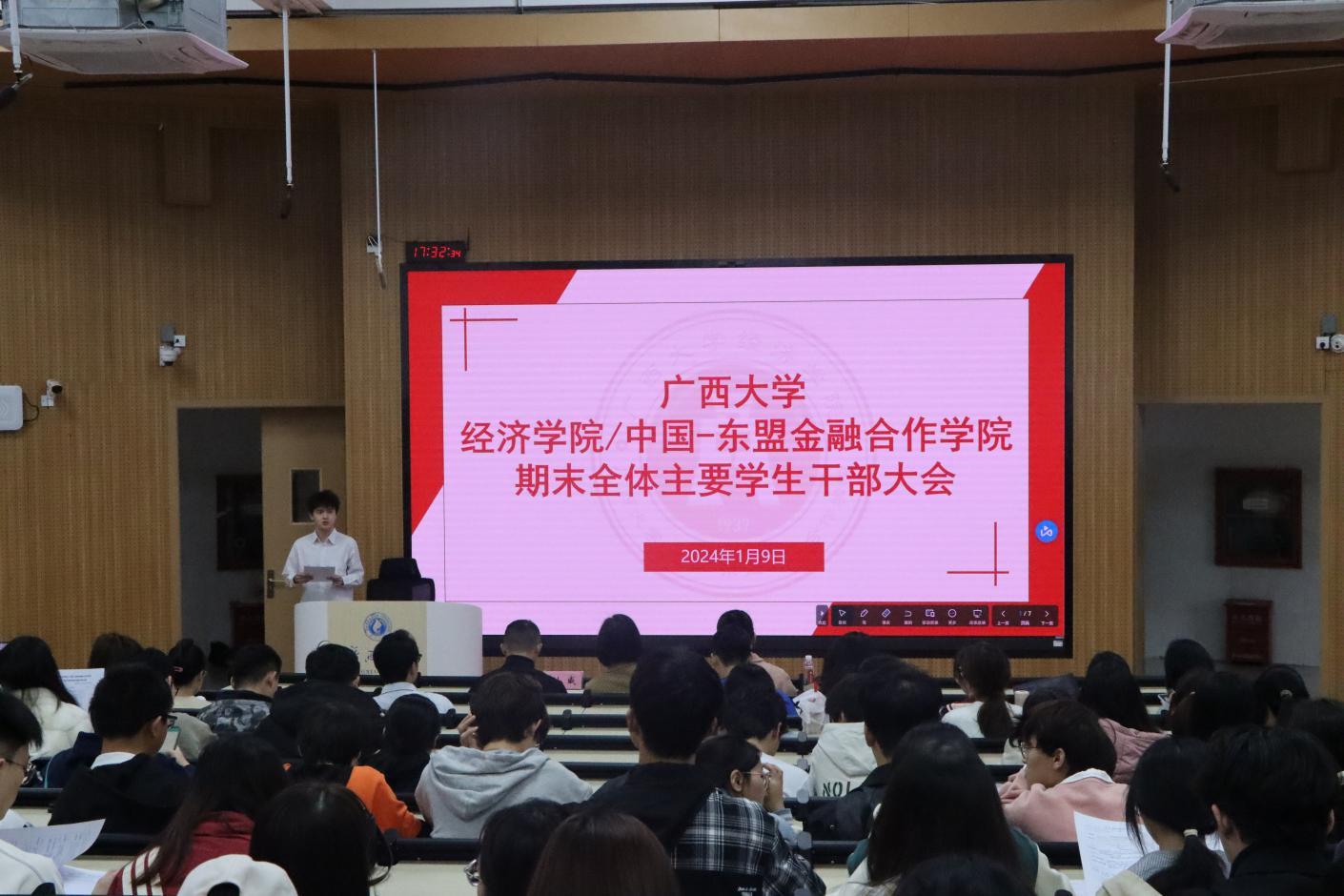 为进一步加强学生干部队伍建设,推动学生教育管理服务工作提质增效,布置安排期末和寒假学生工作,近日,经济麻豆影片/中国-东盟金融合作麻豆影片学工组在第十教学楼10A-305教室组织召开2023-2024学年秋季学期期末全院主要学生干部大会。院党委副书记陈卉娟、团委书记王海希、辅导员覃晓阳、刘威,以及院级团学组织主要学生干部、各班班长和团支书参加本次会议。