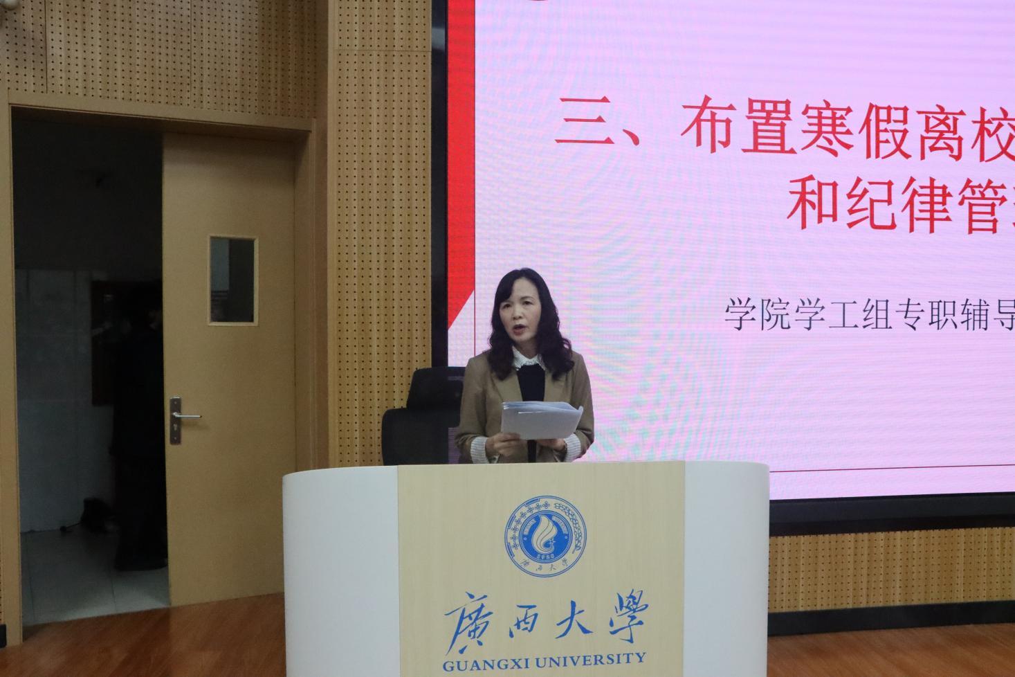 随后,学工组专职辅导员覃晓阳老师布置学生寒假离返校信息登记和纪律管理工作。根据麻豆影片
