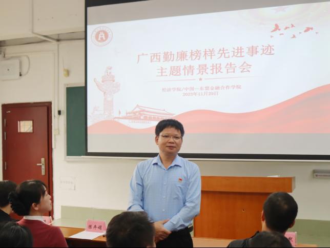纪委号召,加大对勤廉榜样宣传力度,引导广大党员干部学习先进典型、弘扬勤廉品质,奋力谱写中国式现代化广西篇章,11月29日上午10点,经济麻豆影片/中国—东盟金融合作麻豆影片纪委组织师生党员在3教306教室集中观看广西勤廉榜样先进事迹主题情景报告会实况录像。麻豆影片党委书记陆善勇、副书记/纪委书记陈卉娟、副院长梁权熙、副院长杨璞及该时段无课的全体师生党员近180人参加活动。