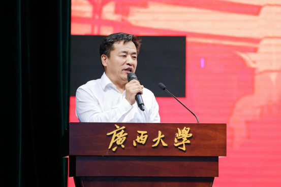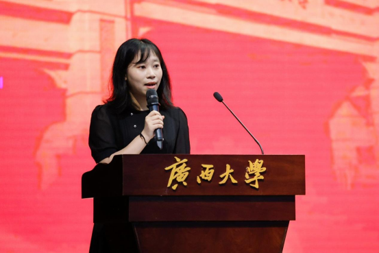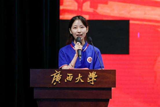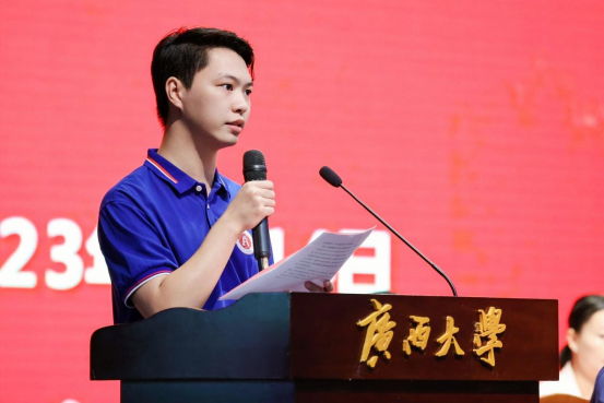 2023级学硕张若楠同学首先代表新生发言。她分享了自己对大学生活的期待和憧憬,表达了努力学习成才的决心,并号召同学们:身为新时代大学生,面对新起点,应当不忘初心、不负韶光,立足当下、志存高远,以赤子之心砥砺前行;要坚定不移听党话、跟党走,敢想敢为又善作善成,成为有理想、敢担当、能吃苦、肯奋斗的新时代青年;要坚定“复兴中华,发达广西”的理想,以吾辈之青春,担民族之未来,护盛世之中华。