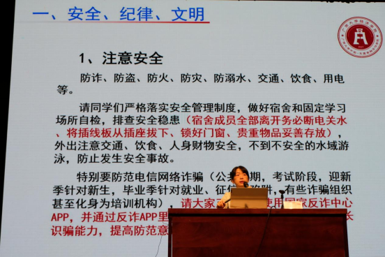 接下来,院党委副书记、纪委书记陈卉娟面向2023级新生开展了安全、纪律、文明,诚信与感恩,廉政及生涯规划方面的教育。