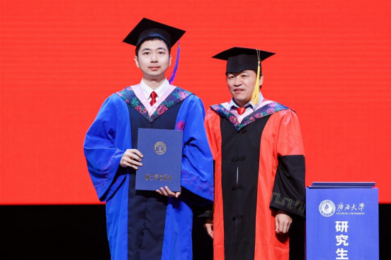 毕业生代表徐震在发言中对学校、师长、同学和父母表达了感恩之情,倡议同学们感恩过往,珍惜当下,开创未来。徐震深情地说:即将离开校园,大家眼神里多了几分坚定、肩背上多了几分责任、脚步下多了几分从容,我们一定要将个人的成长与中华民族实现伟大复兴的中国梦结合起来,踏上建功新时代的征程。