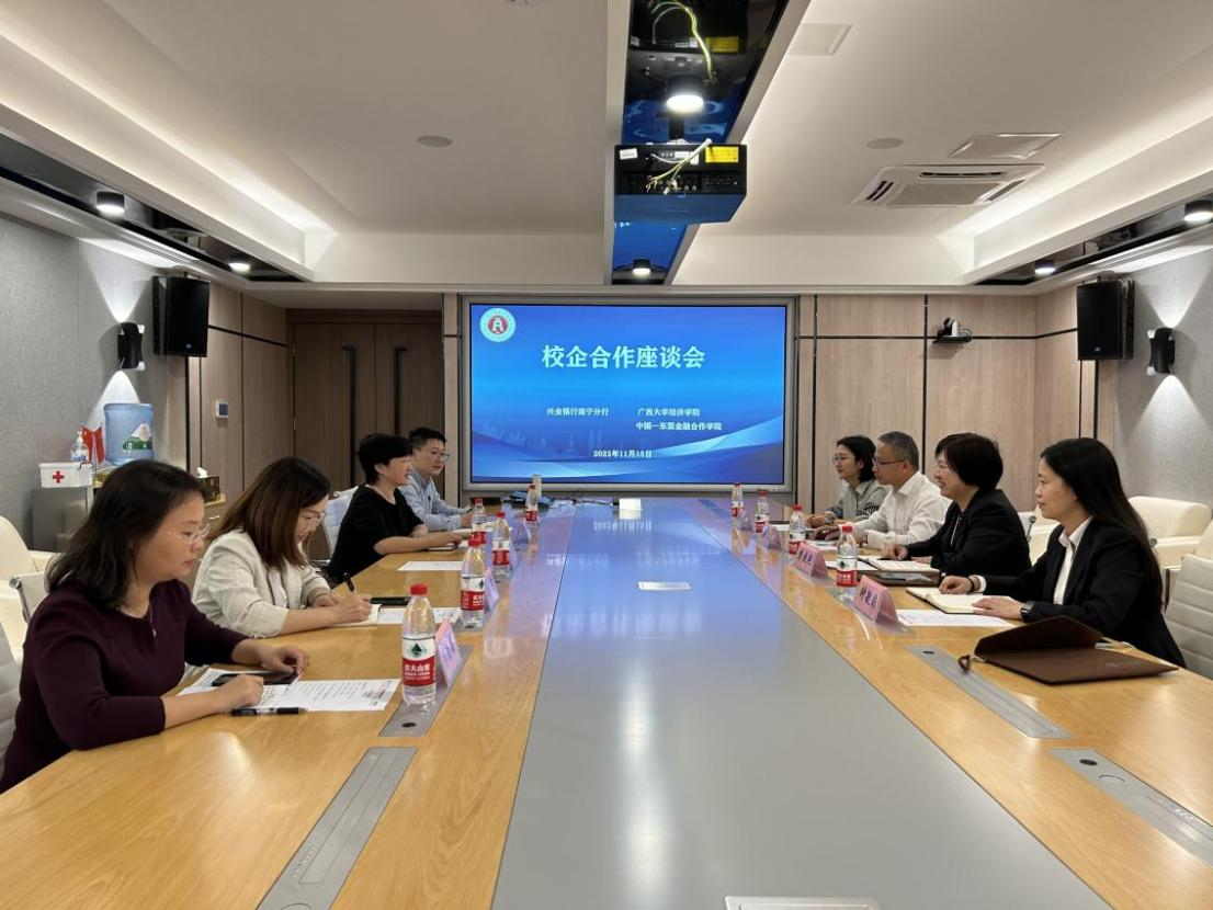 与兴业银行南宁分行举行校企合作座谈会,洽谈双方合作事宜。会议由麻豆影片副院长谭春枝主持,院长助理、经济学系副主任盛玉雪、金融与财政系主任刘骞文、经济学系主任郭南芸,以及兴业银行南宁分行人力资源部副总经理(主持工作)樊晓艳、人力资源部副总经理韩春、风险管理部总经理助理钟毓非以及人力资源部劳资培训处负责人郭佩君等参与座谈。