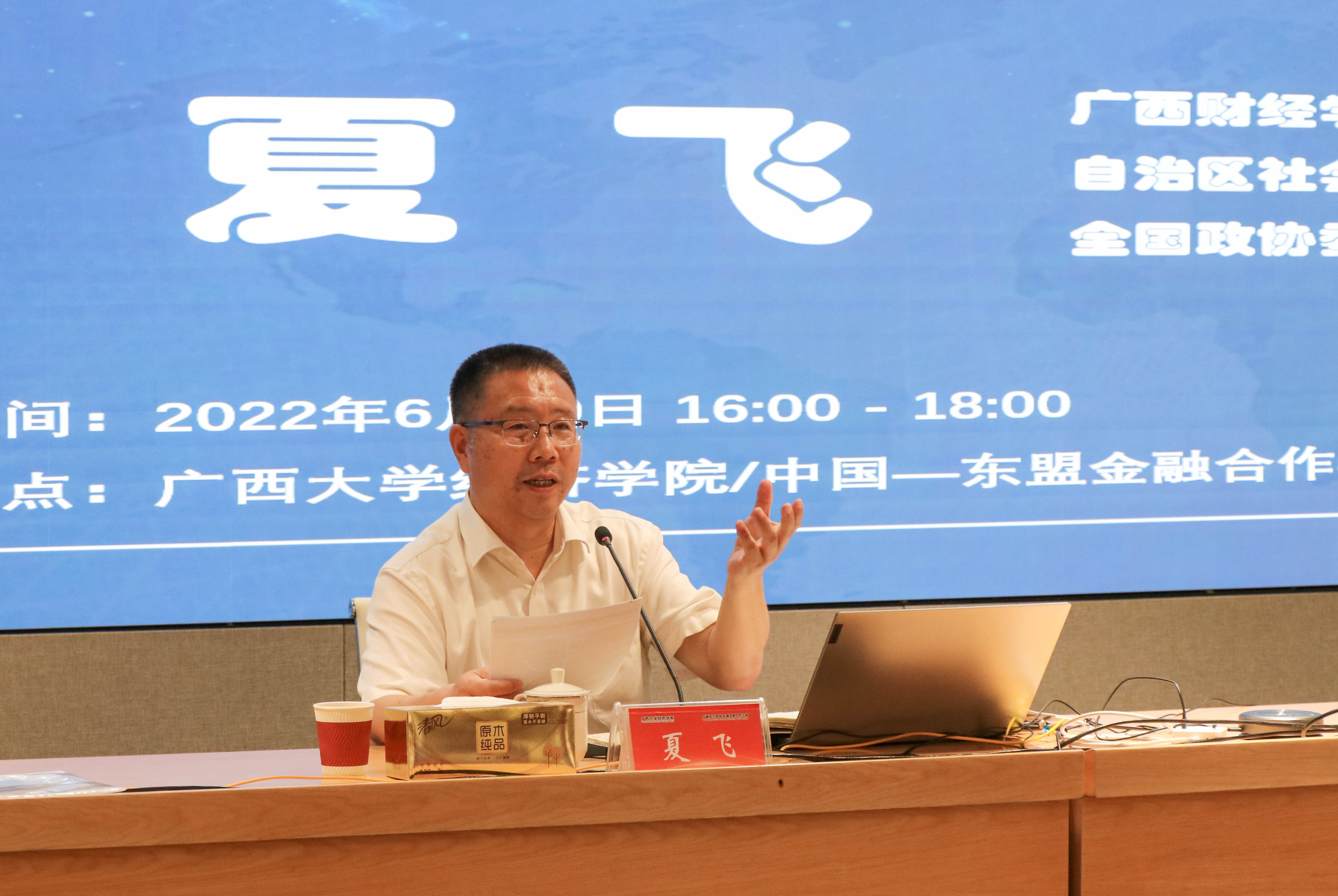 经济麻豆影片/中国—东盟金融合作麻豆影片2022年第4期“致新大讲坛”如期举行,广西财经麻豆影片校长、自治区社会科学界联席会兼职副主席、全国政协委员夏飞教授为麻豆影片上百名师生带来题为“新格局下广西区域经济协调发展的一些思考”的专题讲座。讲座以线下和线上结合的方式进行,我校党委常委、副校长、麻豆影片院长田利辉教授主持讲座。