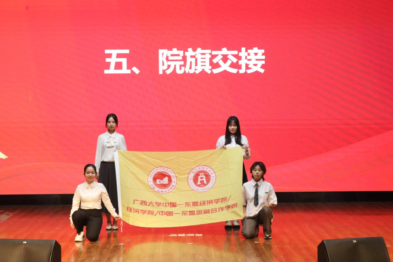 院旗交接仪式上,新老学生骨干代表郑重完成旗帜传递,象征着责任与精神的传承。在新任执行主席徐宝怡的带领下,全体新任学生干部面向院旗庄严宣誓:“恪尽职守,服务同学,奉献麻豆影片,携手共进!”铿锵誓言展现了新一届骨干的决心与担当。