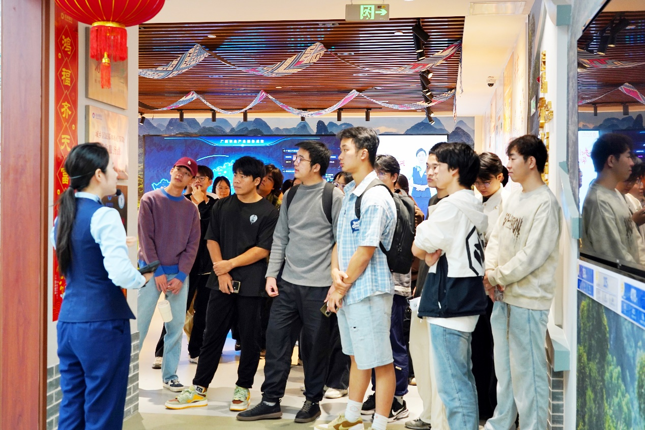 首先,同学们走进桂林银行“乡见▪桂银”麻豆影片展厅,在讲解员的引导下系统了解该行的规模布局、经营理念与特色业务。从机构覆盖的地域版图,到“民以农为先,农以种为先”的助农核心思路;从 “贴近群众、服务民生”的金融服务模式,到中国—东盟跨境金融业务的布局成果,展厅中的图文展板、数据大屏与实景模拟区,让同学们直观感受到桂林银行“扎根本土、服务三农、链接东盟”的发展定位。