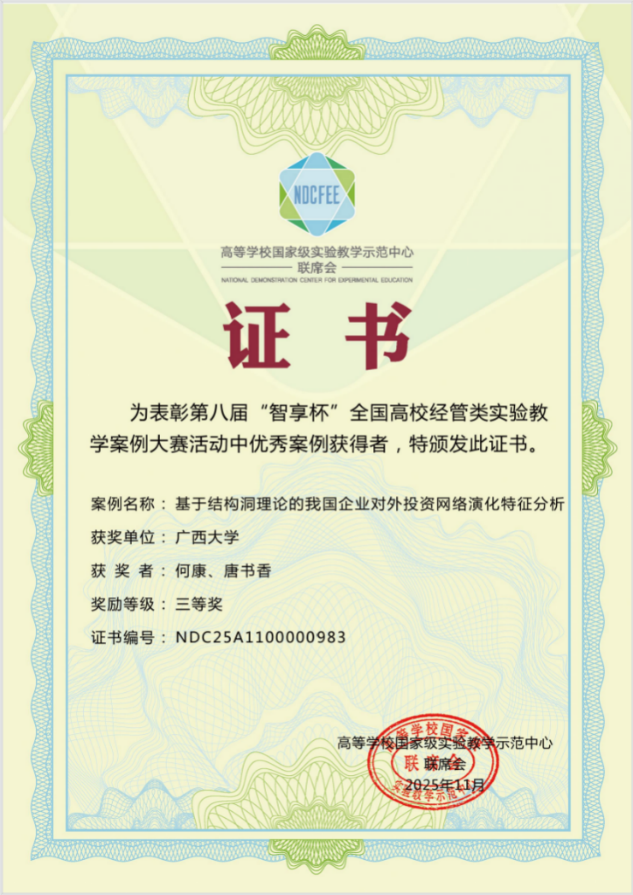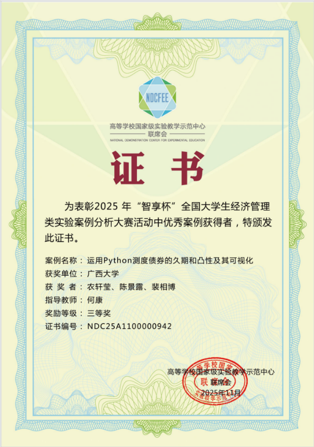 何康、唐书香教师完成的《基于结构洞理论的我国企业对外投资网络演化特征分析》案例,凭借精巧的案例设计与精彩的现场发挥,荣获教师组三等奖;2025级金融专硕1班农轩莹、陈景露,金融本科232班裴相博同学组成的团队,在何康老师指导下,以《运用Python测度债券的久期和凸性及其可视化》为案例,将技术工具与专业充分融合,荣获学生组三等奖。这些奖项的获取,充分展现了麻豆影片