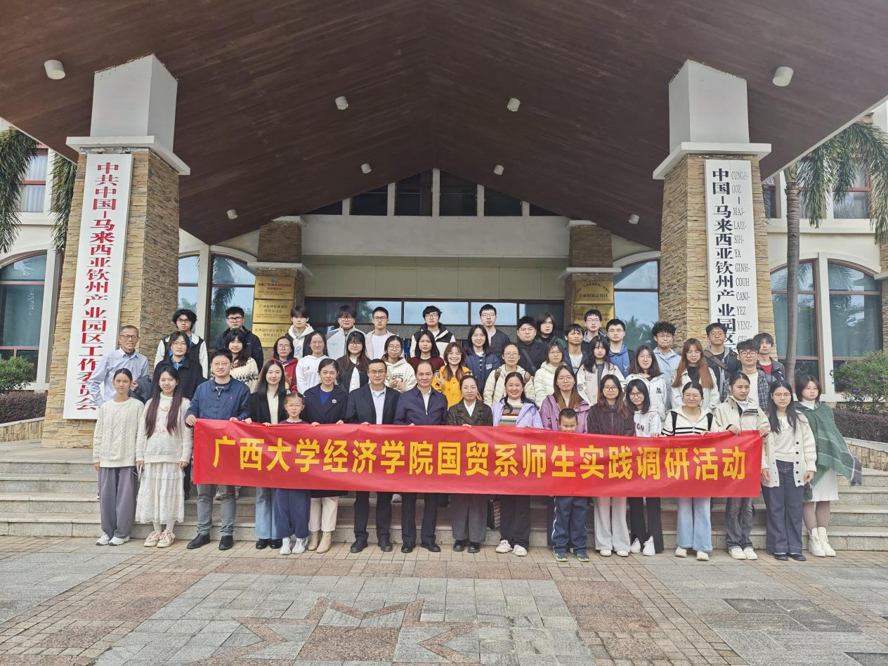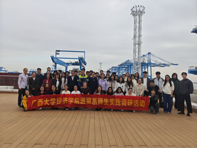 国际经济与贸易专业本科生及部分研究生一行50人赴钦州自贸片区开展实地调研。钦州港片区贸易与物流发展局局长林纲、工作人员潘金鑫校友陪同调研。