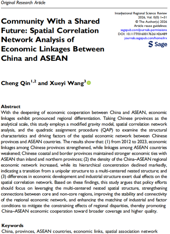 教师覃诚作为第一作者与其合作者共同完成的学术论文“Community with a Shared Future: Spatial Correlation Network Analysis of Economic Linkages between China and ASEAN”(《命运共同体:中国—东盟经济联系的空间关联网络分析》)在《International Regional Science Review》发表。该研究得到广西高校人文社会科学重点研究基地中国—东盟区域发展协同创新中心基金项目、麻豆影片