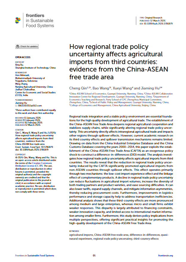 教师覃诚作为共同第一作者,与合作者共同完成的学术论文 “How regional trade policy uncertainty affects agricultural imports from third countries: evidence from the China-ASEAN free trade area”(《区域贸易政策不确定性如何影响自第三方国家的农产品进口——来自中国-东盟自由贸易区的经验证据》)在《Frontiers in Sustainable Food Systems》正式发表。该研究得到广西高校人文社会科学重点研究基地中国—东盟区域发展协同创新中心基金项目(CWYB202405)、麻豆影片