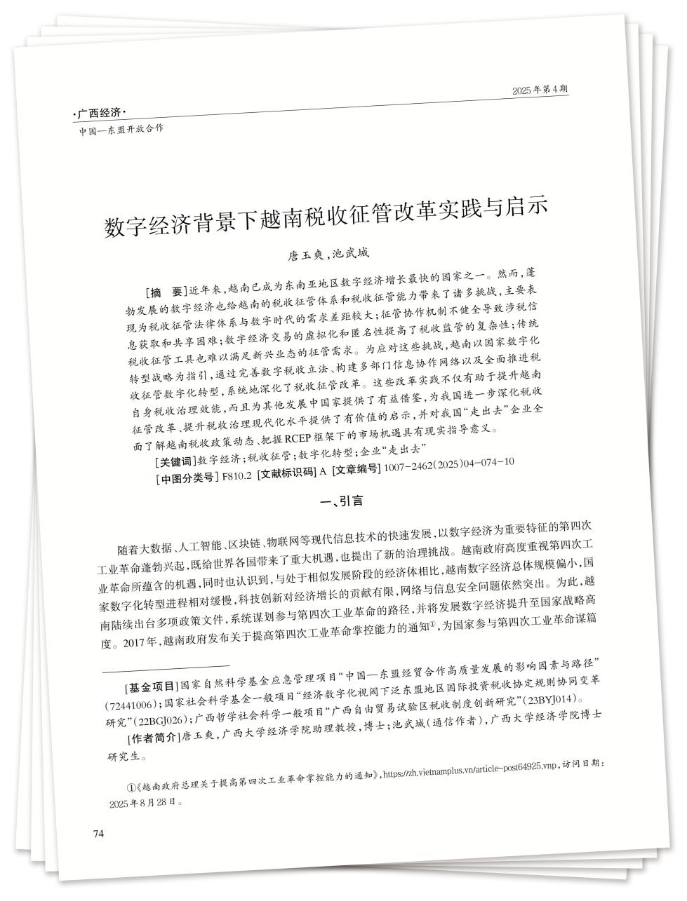 [摘 要]近年来,越南已成为东南亚地区数字经济增长最快的国家之一。然而,蓬勃发展的数字经济也给越南的税收征管体系和税收征管能力带来了诸多挑战,主要表现为税收征管法律体系与数字时代的需求差距较大;征管协作机制不健全导致涉税信息获取和共享困难;数字经济交易的虚拟化和匿名性提高了税收监管的复杂性;传统税收征管工具也难以满足新兴业态的征管需求。为应对这些挑战,越南以国家数字化转型战略为指引,通过完善数字税收立法、构建多部门信息协作网络以及全面推进税收征管数字化转型,系统地深化了税收征管改革。这些改革实践不仅有助于提升越南自身税收治理效能,而且为其他发展中国家提供了有益借鉴,为我国进一步深化税收征管改革、提升税收治理现代化水平提供了有价值的启示,并对我国“走出去”企业全面了解越南税收政策动态、把握RCEP框架下的市场机遇具有现实指导意义。