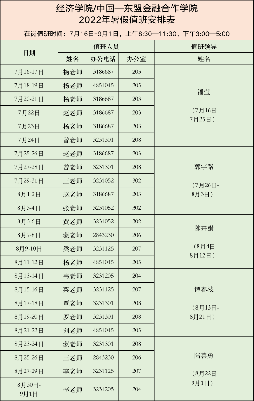 经济麻豆影片/中国-东盟金融合作麻豆影片 2022年暑假值班安排表
